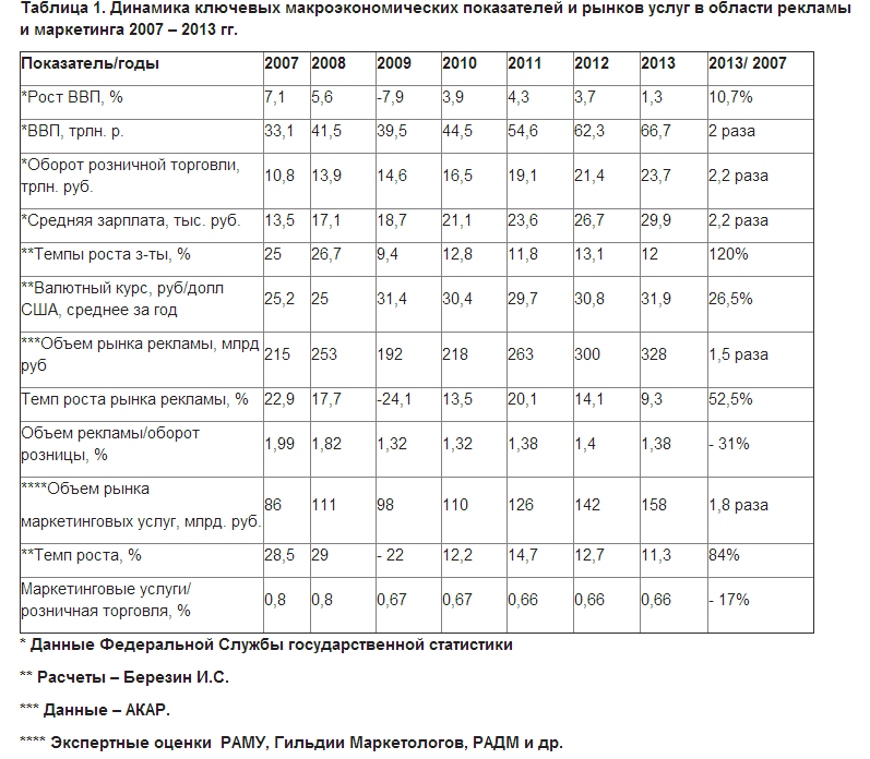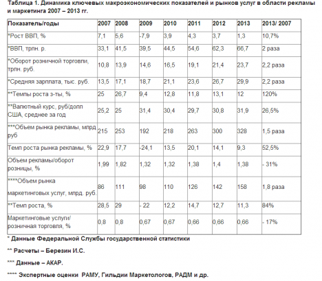 РОССИЯ. Динамика рынка рекламных и маркетинговых услуг существенно отстает от темпов роста базовых макроэкономических показателей. В 2007-2013 годах темпы роста рынка рекламы составили 52,5%, а рынок маркетинговых услуг прибавил 84%, подсчитал член совета директоров Romir и президент Гильдии маркетологов Игорь Березин, передает sostav.ru. Оборот розничной торговли за аналогичный период времени увеличился на 120%.