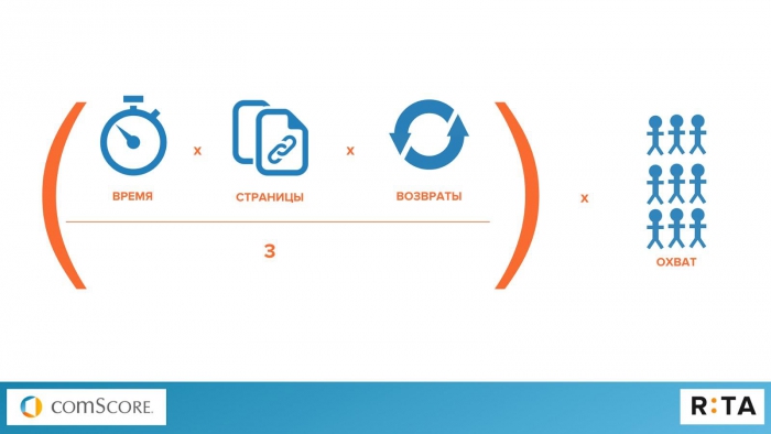 comScore и RTA разработали формулу на основе трех поведенческих показателей, которые отражают вовлеченность пользователя на каждой площадке: время, проведенное на сайте; количество возвратов в течение месяца; количество просмотренных страниц в течение месяца.