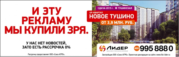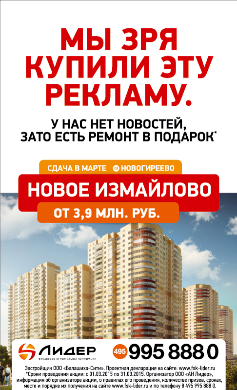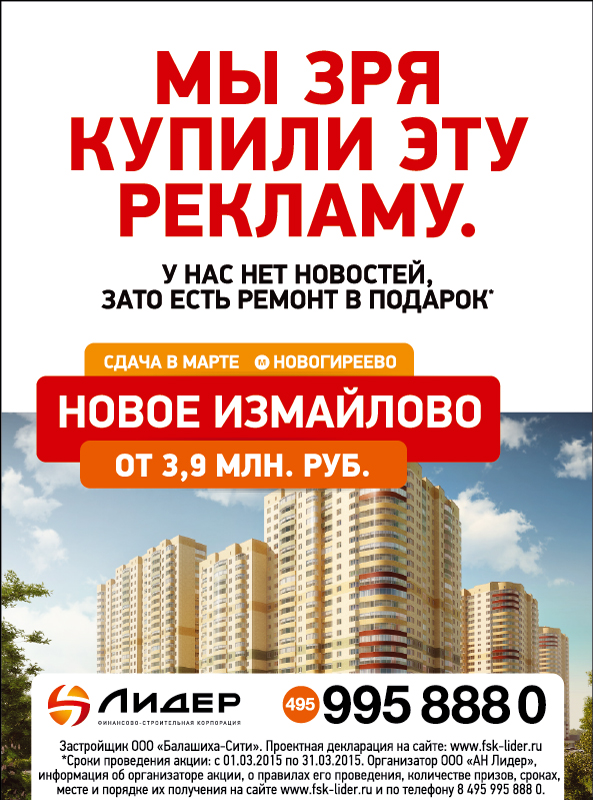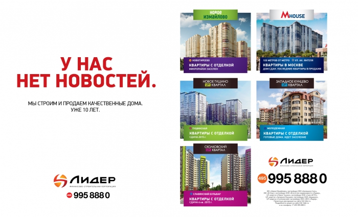 РОССИЯ. ФСК «Лидер» запустила новую рекламную кампанию: «У нас нет новостей. Мы строим и продаем качественные дома. Уже 10 лет». Над проектом работали сразу два известных на рынке агентства – SmartHeart и Zuper. В рамках кампании авторы проекта создали принты с провокационным месседжем, которые были размещены в вагонах московского метро, на крупных новостных сайтах и др.