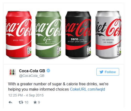 В новой рекламе Coca-Cola призывает потребителей внимательнее относиться к своему здоровью и отдавать предпочтение напиткам с пониженным содержанием сахара. В настоящее время продажи низкокалорийной газировки составляют 43% всего оборота компании, к 2020 году представители Coca-Cola планируют довести этот показатель до 50%.