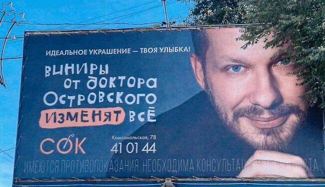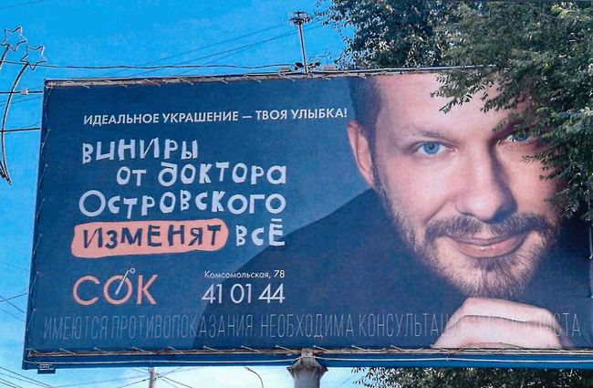 Сама же наружная реклама ортодонтической клиники «СОК» размещена в Хабаровске на Большой улице, 95. На ней изображён мужчина, а текст гласит: