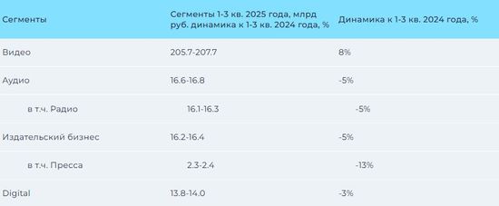 Региональный рекламный рынок в целом в первые три квартала 2025 года также находился в положительной зоне. По итогам девяти месяцев он вырос на 2%, а его объём (без учёта московского рынка) в средствах распространения рекламы по пяти сегментам (видео, аудио, издательский бизнес, наружная реклама и интернет-сервисы) составил почти 93 млрд рублей.