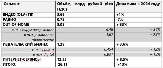 Интернет-сегмент продолжает оставаться крупнейшим по объёму, но темпы роста замедлились. По итогам девяти месяцев 2025 года прирост составил около 8,5% против 25% годом ранее, абсолютная цифра затрат рекламодателей на рекламу в интернете 12,33 млрд рублей.