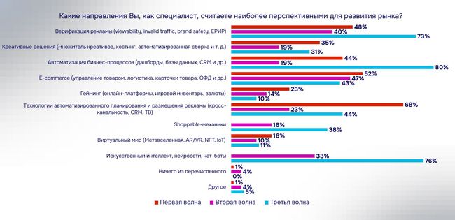 Яркий тренд года – это стремительный рост использования технологий верификации рекламы (viewability, invalid traffic, brand safety, ЕРИР). За год доля использования этих инструментов подскочила на 13 п.п., до 50%, а их перспективность оценивается в 73% (+33 п.п.). Это говорит о массовом запросе рынка на безопасность, прозрачность и контроль за эффективностью рекламных бюджетов.