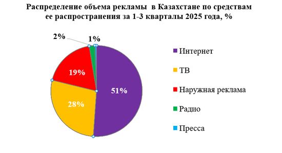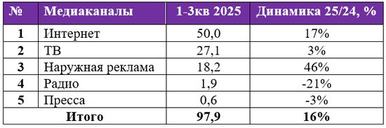 Суммарный объём рекламы в средствах её распространения (ТВ, интернет, наружная реклама, радио, пресса) составил примерно 98 млрд тенге (по сегодняшнему курсу 1 тенге равен 0,15 российского рубля. – Прим. ред.), что на 16% больше по сравнению с тремя кварталами 2024 года (см. таблицу и диаграмму).