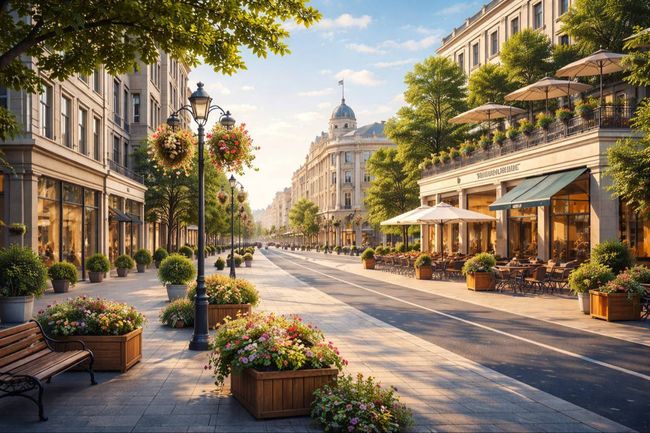 - Благоустройство – обустройство тротуаров, системы освещения, установка скамеек и озеленение.