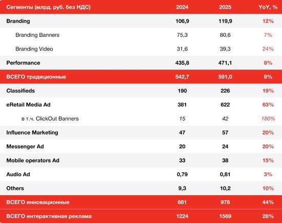Объём сегмента брендинговой рекламы в 2025 году составил 161,9 млрд рублей, что на 33% выше показателей предыдущего года. Баннеры достигли объёма в 122,6 млрд рублей, увеличившись на 36%. При этом кликаут баннеры из рекламы еРетейл медиа, которые учитываются внутри баннеров, выросли с 15 до 42 млрд рублей, то есть на 180%. Видеореклама выросла на 24% и достигла объёма в 39,3 млрд рублей.